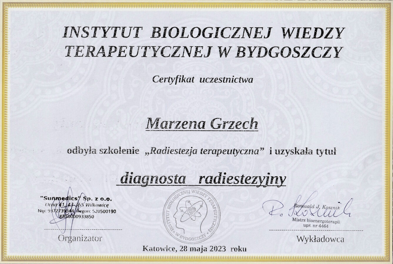 Radiestezja terapeutyczna — kurs zakończony uzyskaniem tytułu: diagnosta radiestezyjny, Instytut Biologicznej Wiedzy Terapeutycznej w Bydgoszczy, 2023